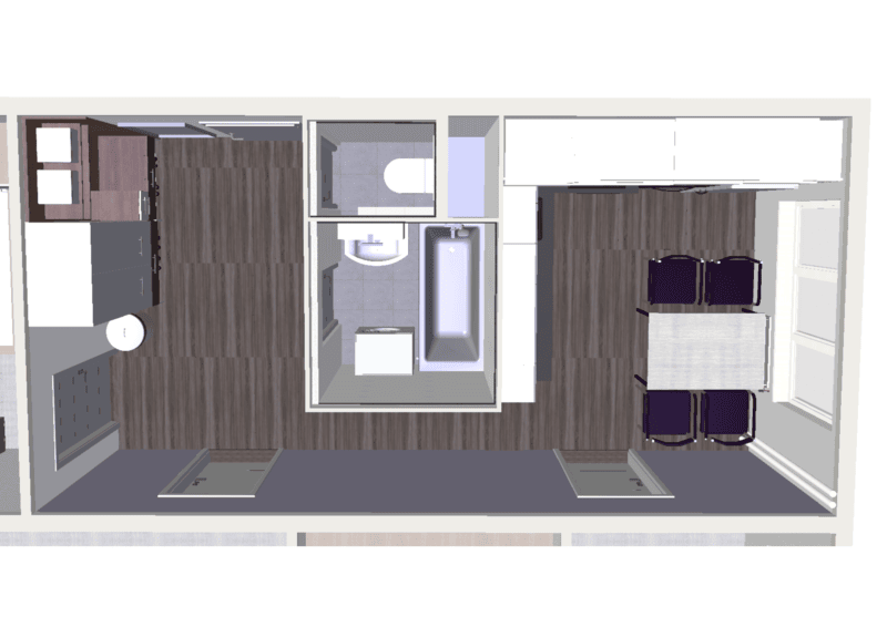 WC zůstává na stávajícím místě a změna umístění koupelny a kuchyně, vybavení sprchový kout |